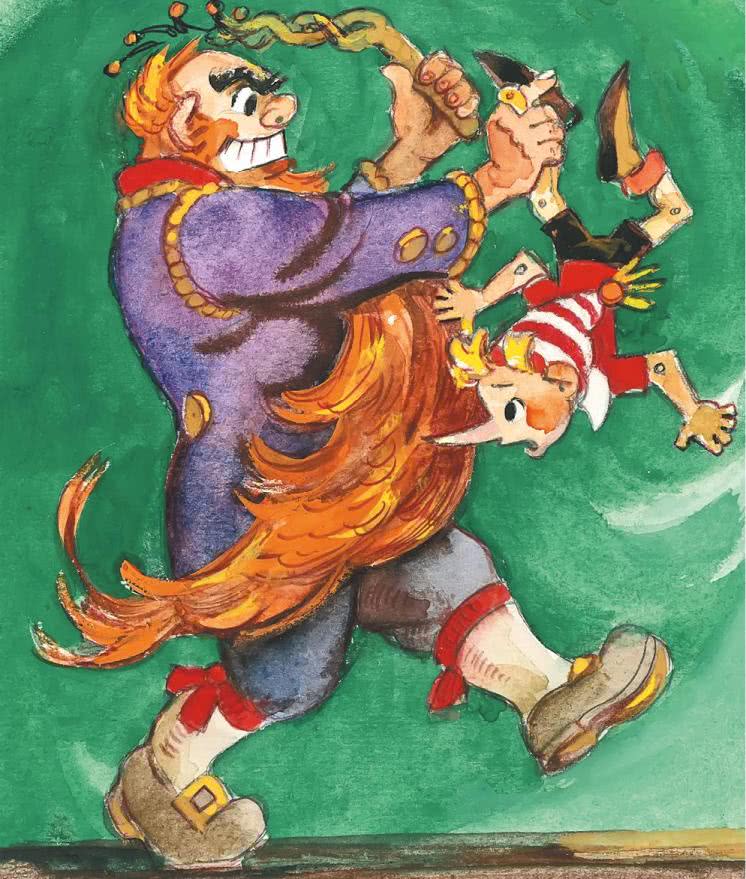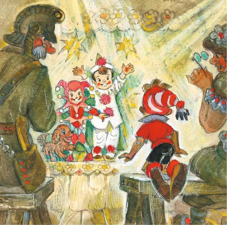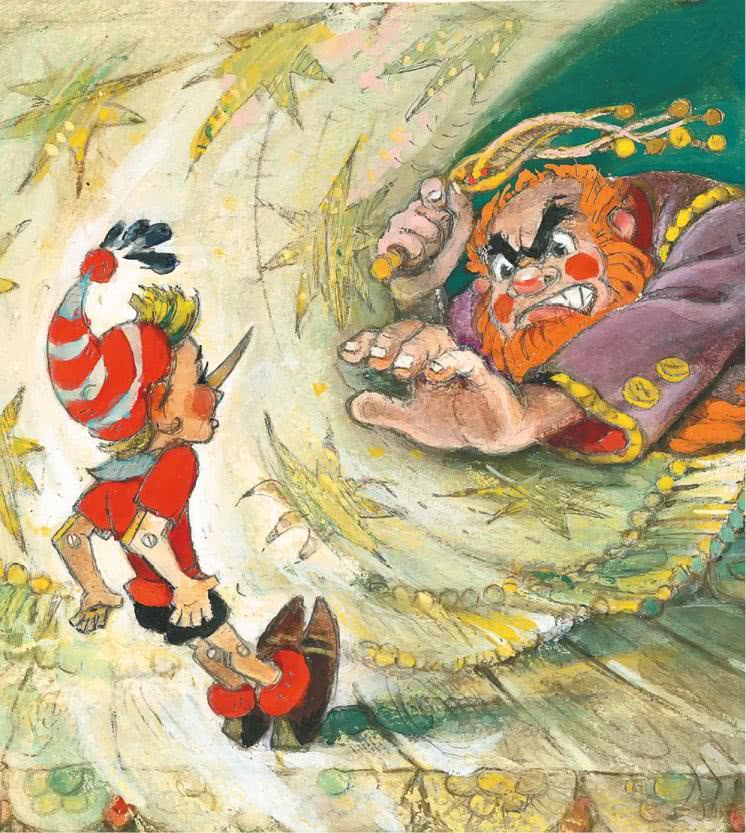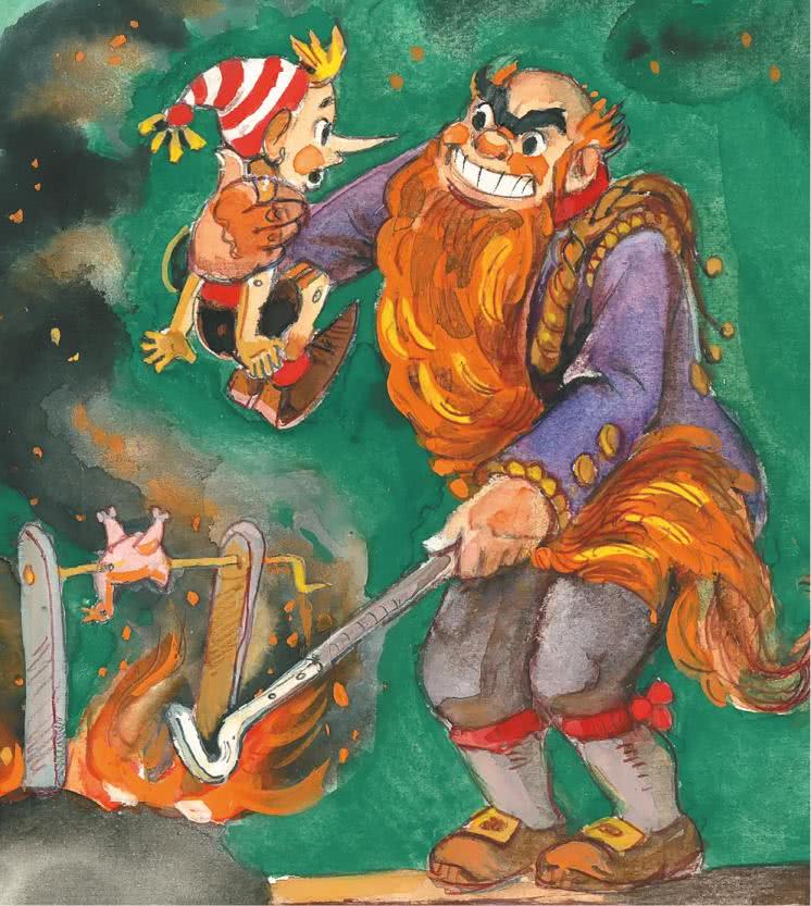 Буратино прыгнул на сцену. Куклы начали его обнимать, целовать, щипать, тормошить. Тогда из-за сцены высунулся такой страшный человек, что можно было окоченеть от страха.