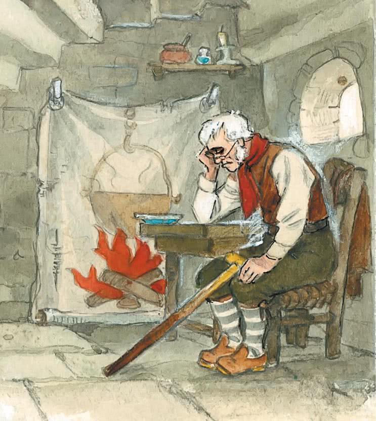 счастью, вернулся папа Карло и запустил башмаком в Шушеру. Она скрипнула зубами и скрылась.Покуда Буратино ел, папа Карло смастерил ему из бумаги курточку и штанишки, а из старого носка – колпачок с кисточкой.
