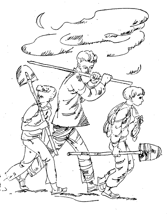 Боря кончил чистить картошку. Поднял кастрюлю, отнес ее к очагу.