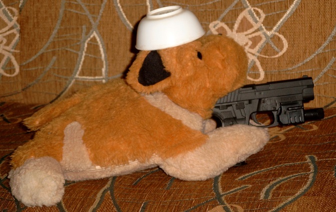 – Ну, вроде пистолета, только стреляет он не пулями. Смотри, здесь вот зубами тянешь до щелчка, потом нажимаешь на спусковой крючок – и из дула на пружине вылетает пластиковая дуля (или шиш, как ещё называют)!