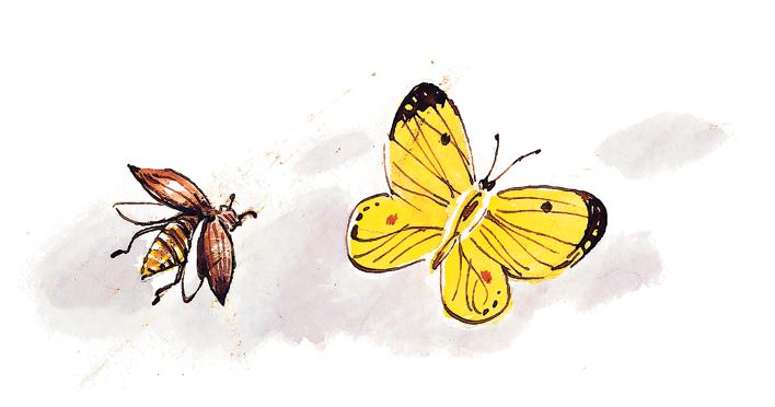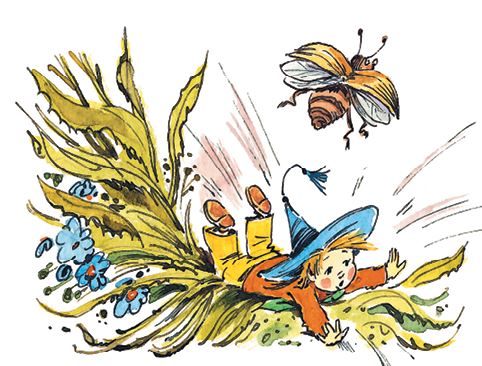 Однажды он гулял по городу и забрёл в поле. Вокруг не было ни души. В это время летел майский жук. Он сослепу налетел на Незнайку и ударил его по затылку. Незнайка кубарем покатился на землю. Жук в ту же минуту улетел и скрылся вдали. Незнайка вскочил, стал оглядываться по сторонам и смотреть, кто это его ударил. Но кругом никого не было.
