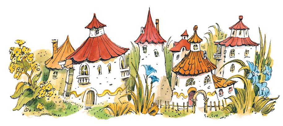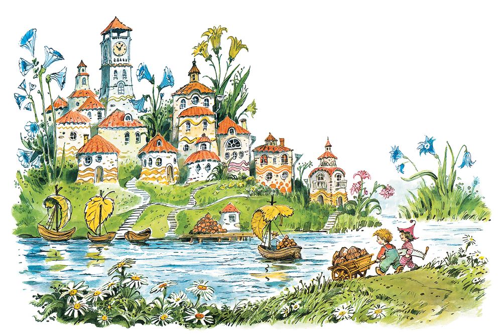 За рекой был лес. Коротышки делали из берёзовой коры лодочки, переплывали через реку и ходили в лес за ягодами, за грибами, за орехами. Собирать ягоды было трудно, потому что коротышки ведь были крошечные, а за орехами и вовсе приходилось лазить на высокий куст да ещё тащить с собой пилу. Ни один коротышка не смог бы сорвать орех руками – их надо было пилить пилой. Грибы тоже пилили пилой. Спилят гриб под самый корень, потом распилят его на части и тащат по кусочкам домой.
