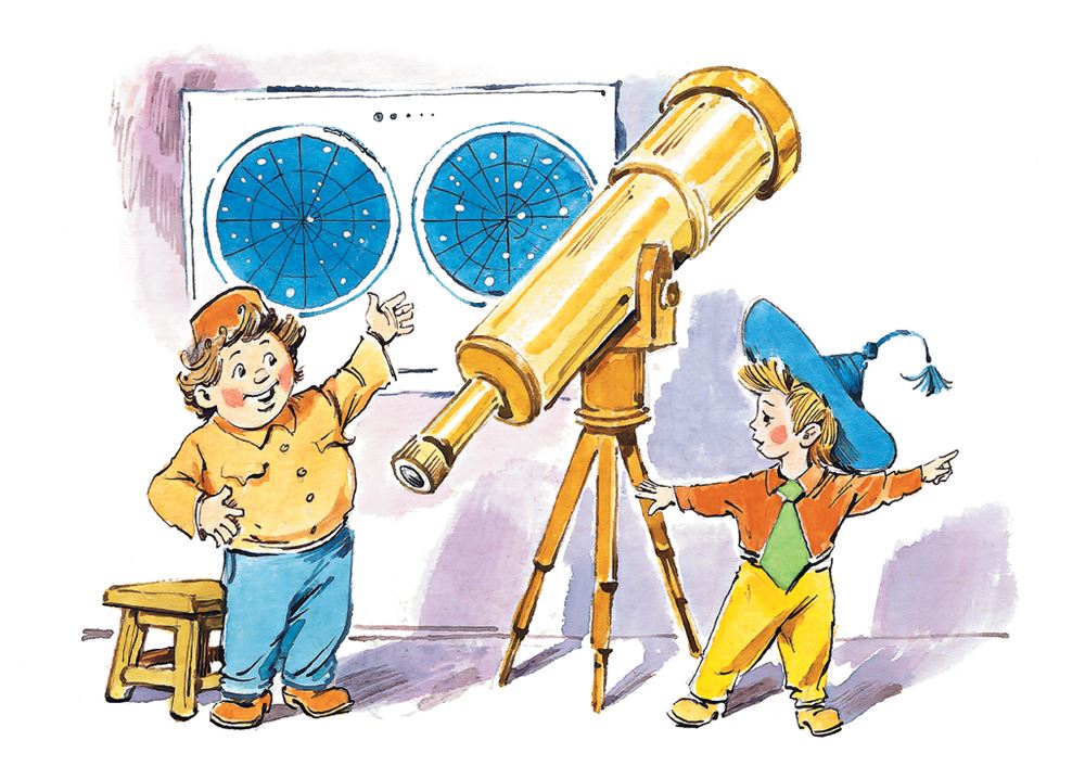 Он пошёл домой и встретил знакомого, которого звали Стекляшкин. Этот Стекляшкин был знаменитый астроном. Он умел делать из осколков битых бутылок увеличительные стёкла. Когда он смотрел в увеличительные стёкла на разные предметы, то предметы казались больше. Из нескольких таких увеличительных стёкол Стекляшкин сделал большую подзорную трубу, в которую можно было смотреть на луну и на звёзды. Таким образом он сделался астрономом.