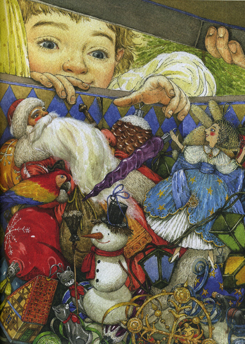 Снеговик принялся карабкаться к крышке, расталкивая соседей. Всем известно, что те игрушки, которые лежат сверху, вешают на ёлку первыми. За ним поспешили Картонный Домик, Серебряная Фея, Сосулька и Шишка.