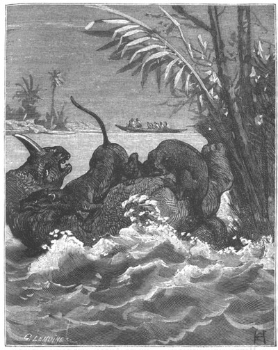 Вслед за криком, очевидно послужившим сигналом, из густых кустов позади этой махины выскочили два гибких, проворных зверя и разом обрушились на толстокожего.
