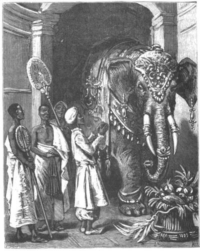 Обновили пурпурную тиару, сверкающую рубинами и алмазами дивной красоты. Сам император своими августейшими руками прикрепил к ней алмазную эгретку. Каждый день слону надевали парадный костюм. На голову, как у императора и знатных вельмож, прикрепляли дощечку с указанными титулами, между глазами сверкал полумесяц из драгоценных камней, в ушах болтались крупные золотые серьги. Исхудавшее тело покрывал роскошный пурпурный чепрак, вышитый золотом и шелками, сверкавший жемчугом и каменьями. Любимые вожатые держали над ним четыре золотых зонтика, и, чтобы он мог всегда любоваться собственным великолепием, за яслями установили большое зеркало, выписанное из Парижа. Обошлось