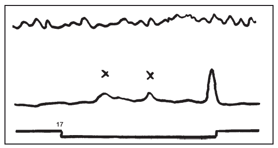 Отчет испытуемого показал, что первое пришедшее ему в голову слово «было неудобно произносить», он задержал его и сказал первое попавшееся ему после этого. Сопряженная моторная кривая дает достаточно точное отражение этой структуры: через 0,8" после подачи раздражителя мы получаем резкий моторный импульс, быстро тормозящийся, и только через 6" следует окончательная, соответствующая открытому речевому ответу, реакция.