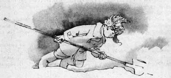Я размахиваюсь и кидаю камень. Но он летит мимо. Я опять кидаю. И опять мимо. И девочка все это видит. Тогда я хорошенько прицеливаюсь в одного жирного голубя и опять швыряю... и попадаю прямо в этого голубя! Голубь кувыркнулся и полетел. За ним все птицы. Они взвиваются прямо тучей. И тут кто-то хватает меня за воротник...
