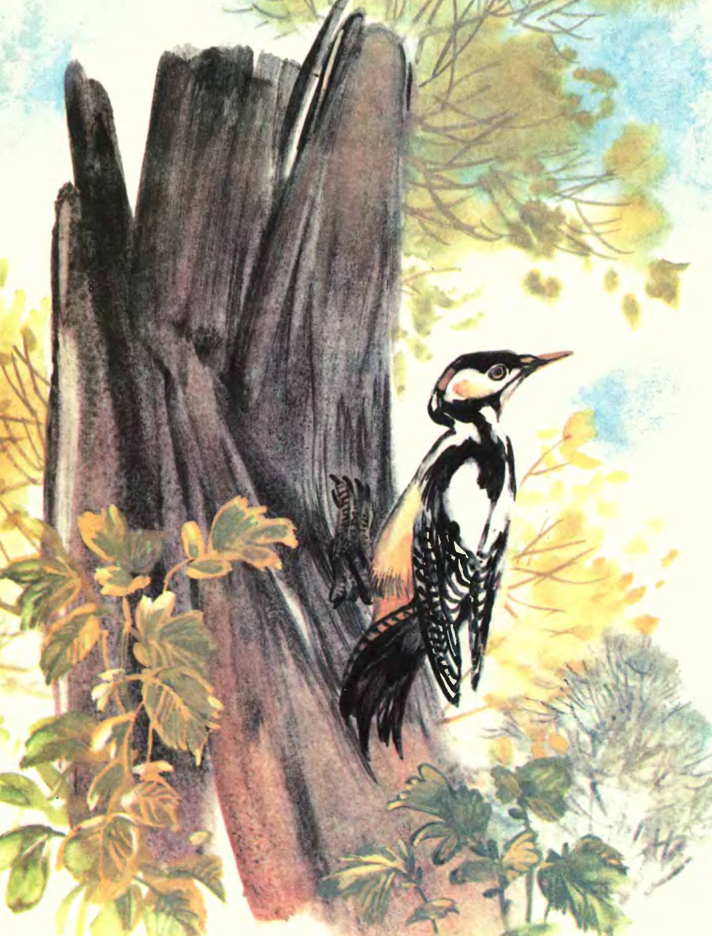 Дятел — древесная птица. Он долбит больные деревья и достаёт длинным языком жуков-вредителей и их личинки. Если много дятлов в лесу — значит, будут деревья крепкими и здоровыми.
