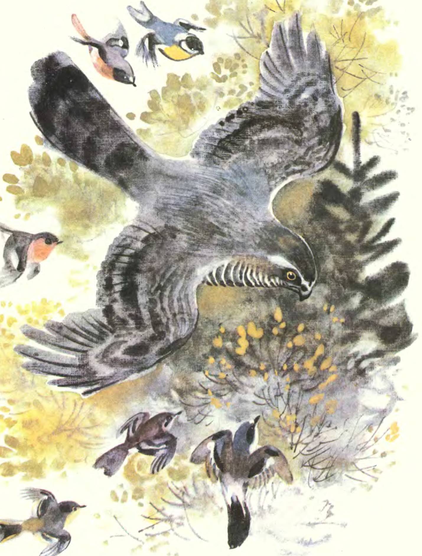 Как появится ястреб-тетеревятник, в лесу переполох: надо прятаться. Даже зайцы затаиваются на земле. Быстро летит тетеревятник между деревьями, высматривает добычу, а за ним с писком, с криками летят лесные птицы: сойки, синицы, чижи. Белка зазевается, не успеет юркнуть в дупло — схватит её тетеревятник. С большой высоты видит тетеревятник и лесную мышь, и тетёрку, если она плохо затаилась. Ястреб-тетеревятник — лесной хищник.
