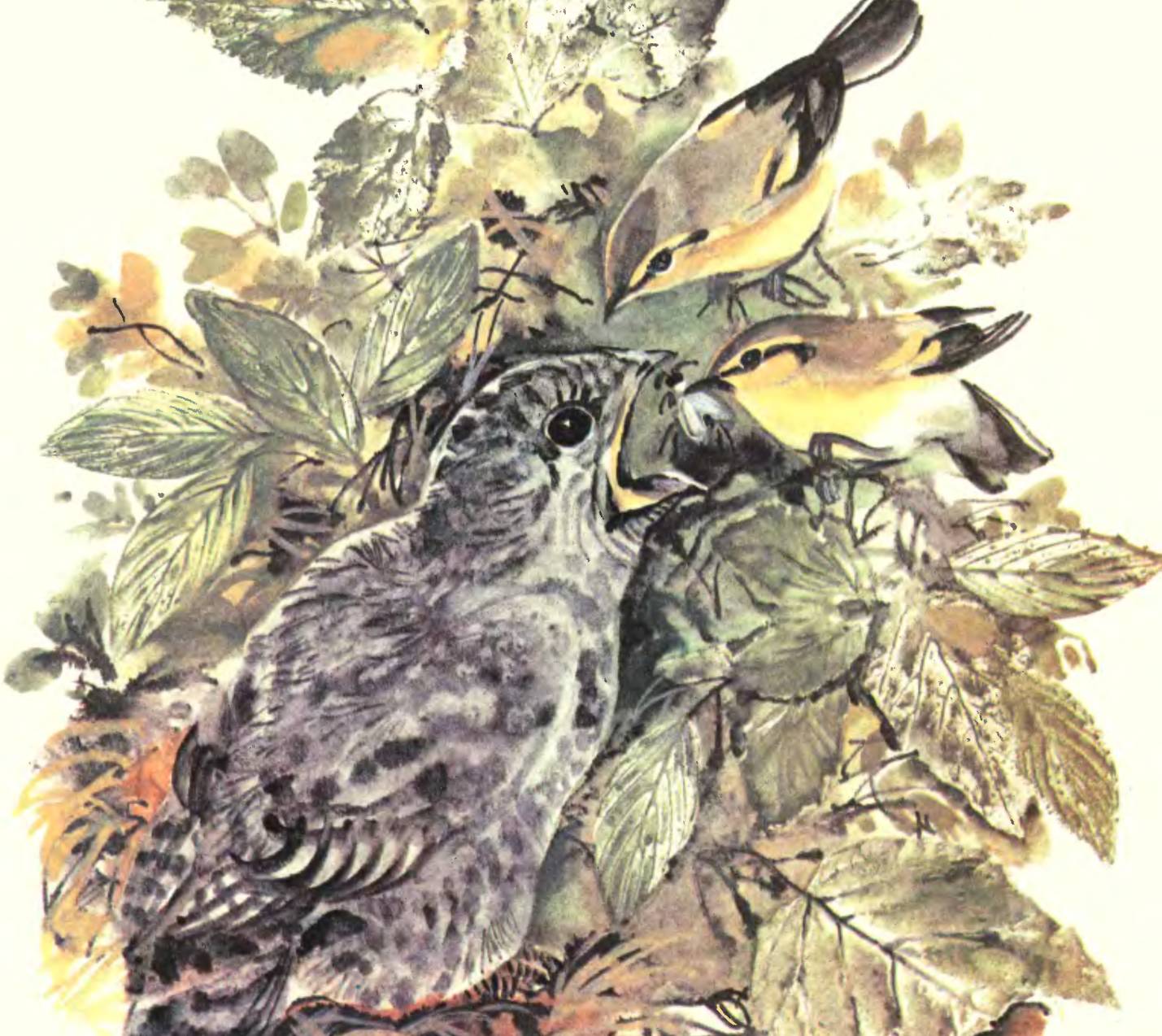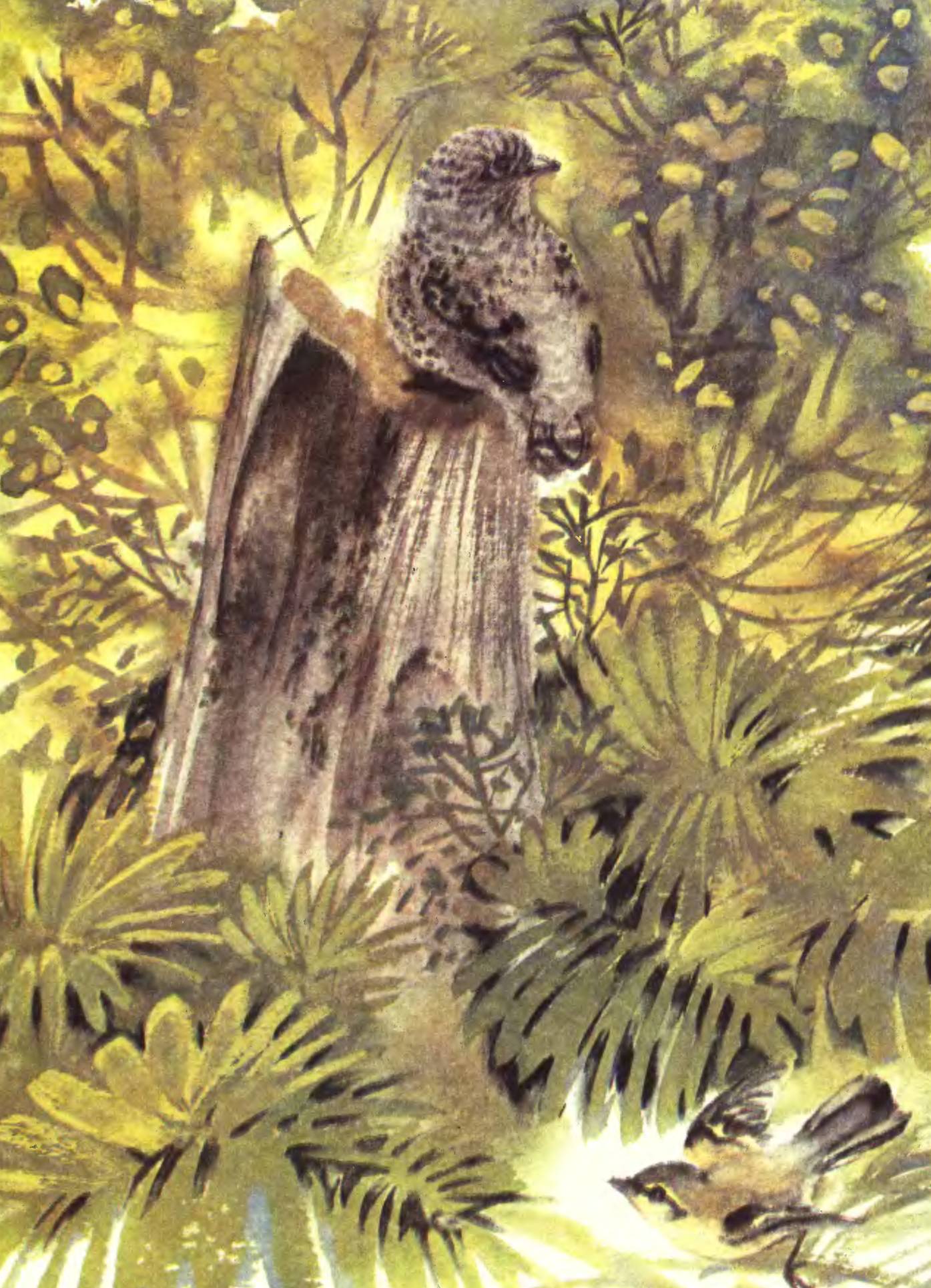 Вот и высидели пеночки кукушонка. Он первым делом как подрос, пеночкиных птенчиков из гнезда выкинул на землю. И теперь — вот какой большой! Целый день пеночки носят гусениц, личинок, жуков — и всё кукушонку мало, клюв разевает и пищит.
