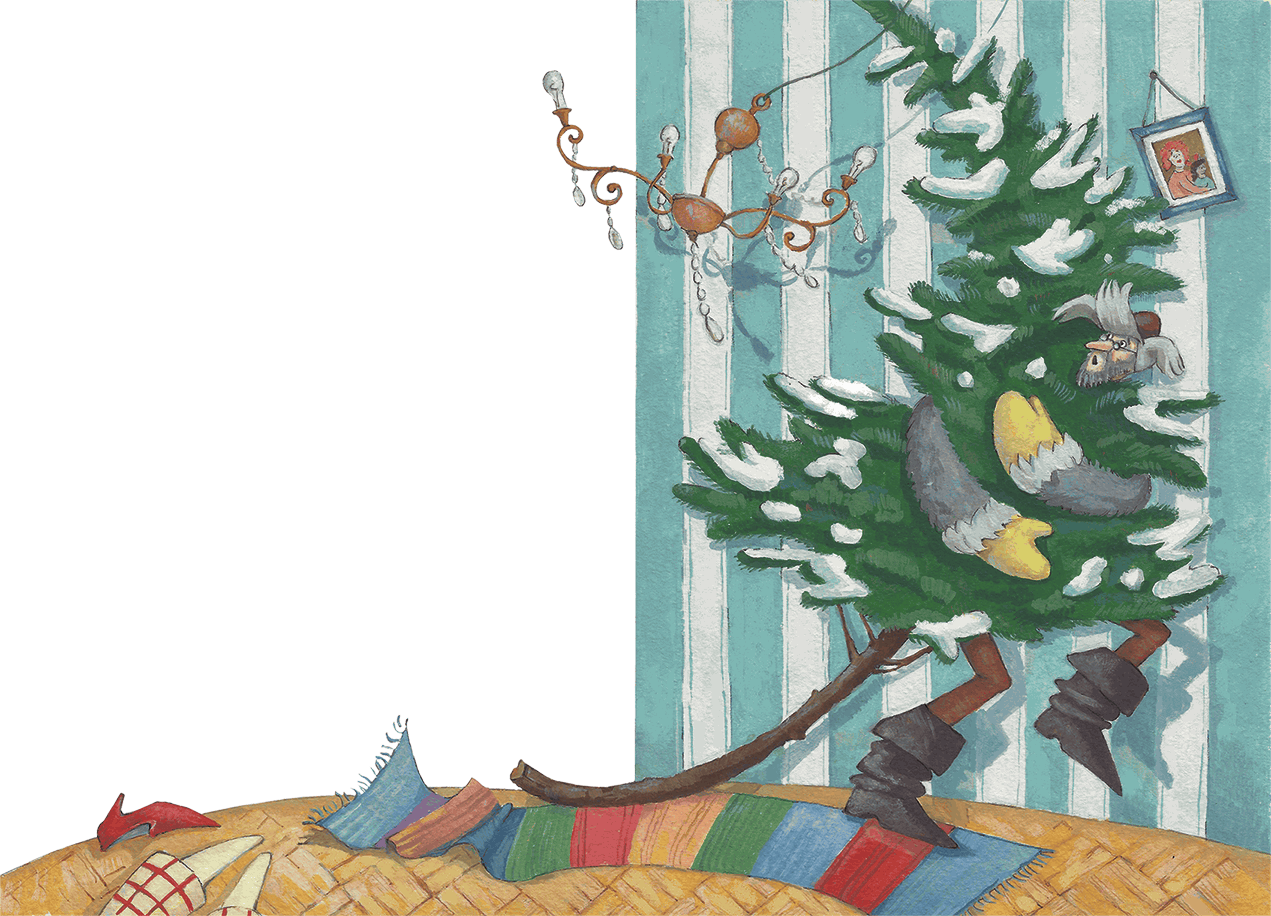 Дедушка схватил ёлку за верхушку, Гриша за ветку, Глаша за верёвку, и они все вместе её потащили. Но ёлка зацепилась за шкаф, который стоял в углу коридора рядом с дверью в комнату, и застряла на повороте, загородив проход.