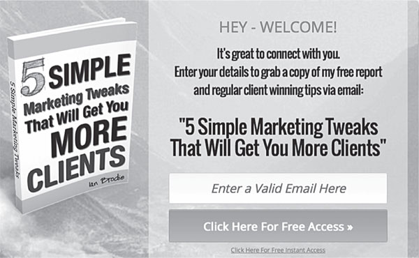 На рис. 6 показан пример простой целевой страницы моего сайта. Она открывается посетителям, которые кликнули ссылку в одном из моих профилей в социальных сетях или в моей гостевой статье на другом сайте. На этой странице – только изображение магнита для потенциальных клиентов, его описание и форма подписки. Из текста понятно, что вы получите в случае подписки, и нет ничего, что могло бы отвлечь ваше внимание.