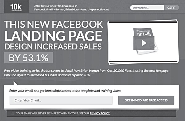 Кроме того, на целевой странице должен красоваться эффектный заголовок, четко заявляющий, что именно посетители получат от вашего магнита и регулярной рассылки. Вот пример от гуру Facebook Брайана Морана: