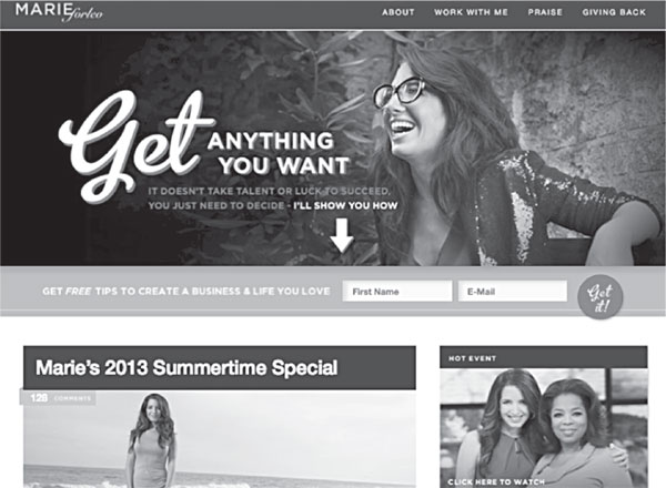 Почти всю главную страницу сайта восходящей звезды интернета Мари Форлео занимает огромный заголовок, призывающий подписаться на ее рассылку.