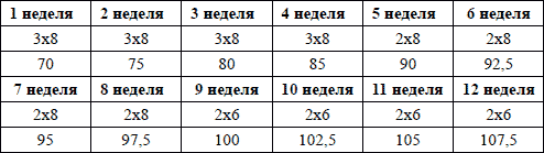 В качестве примера для нашего комплекса вполне может подойти линейный метод циклирования нагрузки. А поступить нужно следующим образом. Предположим, что ваши результаты в жиме лежа остановились на 100 кг в 8 повторениях, и, что бы вы не предпринимали, перепрыгнуть этот рубеж не удавалось. Тут следует пойти на маленькую хитрость. Отнимем от результата 100 кг примерно 30 %, получится 70 кг. Вот с этого веса и начнем строить свой мезоцикл. Его продолжительность в нашем случае будет 12 недель. Теперь этот отрезок времени разделим на три части, получится каждая по 4 недели. Каждый из этих трех этапов будет отличаться от других, общей тренировочной нагрузкой. Первые четыре недели вам больше будет казаться, что вы тренируетесь с разминочными весами, и вполне возможно появится некоторая неудовлетворенность от проделанной работы. Но наберитесь терпения. Такое снижение рабочих весов является необходимой мерой для дальнейшего роста результата. На протяжении всего мезоцикла тренировочные веса должны непрерывно и постоянно увеличиваться. В самом начале цикла на каждой тренировке можно накидывать на штангу по 2,5 или даже по 5 кг. Но это только первые четыре недели. В дальнейшем ваши рабочие веса будут постепенно приближаться к тому максимуму, на котором все когда-то остановилось. А это значит, что темпы роста рабочего веса должны постепенно снижаться и на втором этапе, где общая нагрузка превратится из легкой в среднюю, прибавка должна уже быть не более 2,5 кг за тренировку. К концу восьмой недели тренировок вы уже доберетесь до вашего когда-то максимального рабочего веса. Конечно, прежние килограммы не будут сдаваться просто так и потребуют от вас немало усилий для их покорения, но в целом запас сил уже будет значительно больше прежнего. Почувствовав такое преимущество своих возможностей, не стоит от радости сразу выкладываться на все сто. Сделайте запланированное количество повторений и остановитесь на этом. Даже имея запас сил еще на пару, тройку повторений, не нужно поддаваться искушению и пытаться их сделать. Силы вам еще понадобятся для дальнейшего покорения рабочих весов. Ведь тренировочный цикл на этом не заканчивается, а напротив, все его прелести только начинаются и будут вас радовать оставшиеся четыре недели. Наша главная задача — не просто покорить прежний максимум, но и увеличить его. На конечном этапе увеличение веса штанги еженедельно 2,5 кг может показаться уже слишком ощутимой прибавкой. В таком случае придется накидывать всего по 1 кг или даже по 500 гр. Это необходимо для того, чтобы сама прибавка протекала не заметно для вас самих. Также это можно назвать еще и психологическим фактором. Глядя на накинутые по краям штанги к основному рабочему весу еще пару блинов по 0,5 кг, сомнений будет намного меньше в том, что сама прибавка может быть ощутимой. В то время как довесок, состоящий из пары блинов по 2,5 кг, может уже возыметь обратный эффект. Во тогда рост результатов остановится раньше положенного времени. Незначительная прибавка в весе отягощения придает куда больше уверенности при поднятии тяжелых весов.