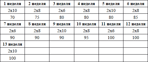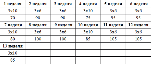 Получается, что сам мезоцикл делится на тяжелые и легкие микроциклы. Но разницу эту можно почувствовать только тогда, когда вы подберетесь к максимальным рабочим весам. В качестве примера стартовый вес штанги возьмем 70 кг в трех подходах десяти повторений. На второй и третьей неделе количество рабочих повторений снизится до шести, а рабочий вес увеличится аж на 20 кг. Возможно, такая резкая прибавка килограммов вызовет у вас небольшое сомнение. Ведь я, напротив, всегда рекомендовал увеличивать нагрузку плавно и постепенно. А такой резкий рост килограммов немного противоречит озвученным мною ранее принципам. Хочу вас сразу немного успокоить. Такие резкие скачки веса отягощения и объема вполне допустимы, если вы делите свой мезоцикл на несколько микроциклов, во время которых и следует устраивать подобные перепады нагрузки и объема. Но, опять же, не стоит забывать, что в самом начале цикла нагрузка должна быть значительно ниже. А дальнейшие ее изменения, наоборот, только могут вызвать у вас больший интерес к комплексу. Вплоть до 8-й недели такой волнообразный рост рабочих весов не будет казаться вам запредельной нагрузкой, поскольку запас сил еще остается большим. Все прелести тяжелого тренинга можно прочувствовать только после девятой недели.
