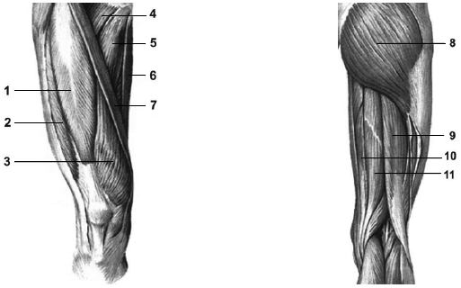 Мышцы таза и бедра: 1 — прямая мышца бедра; 2 — латеральная широкая мышца бедра; 3 — медиальная широкая мышца бедра; 4 — гребешковая мышца; 5 — длинная приводящая мышца; 6 — тонкая мышца; 7 — портняжная мышца; 8 — большая ягодичная мышца; 9 — двуглавая мышца бедра; 10 — полуперепончатая мышца; 11 — полусухожильная мышца.