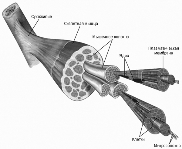 Если посмотреть на мышцу в разрезе, мы увидим мышечные волокна, собранные в пучки, покрытые соединительной тканью. Она окружает мышцы и придает им форму. Каждый пучок содержит множество мышечных волокон, также покрытых соединительной тканью. Мышечное волокно является отдельной мышечной клеткой. В каждом волокне в свою очередь содержится от нескольких сотен до несколько тысяч миофибрилл. Они представляют собой палочкообразные структуры, простирающиеся на всю длину волокна. Пространство между мышечными волокнами заполнено желатинообразной жидкостью — саркоплазмой. Она содержит главным образом растворимые белки, микроэлементы, гликоген, жиры и необходимые органеллы.