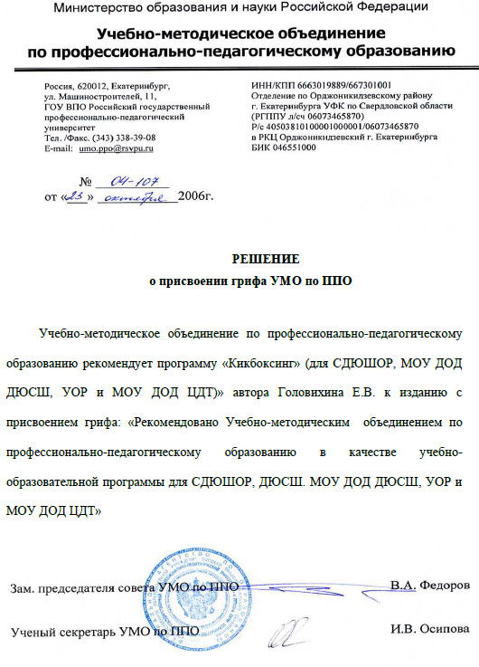 Это второе издание программы переработанное и дополненное новыми материалами спортивной практики. Первое издание публиковалось в 2003 году Главным Управлением образования администрации Ульяновской области. Приказ № 294 от 04.04.2003 года. Программа по кикбоксингу для образовательных учреждений Российской Федерации составлена в соответствии с Законом Российской Федерации «Об образовании» от 13.01.1996 г. № 12-фз, типовым положением об образовании детей – Постановлением Правительства РФ от 07.03.1995 г. № 233, нормативными документами Министерства Образования «Нормативно-правовые основы, регулирующие деятельность спортивных школ» от 25.01.1995 г. и Государственного комитета Российской Федерации по физической культуре, спорту и туризму за № 390 от 28 июня 2001 г. Программы для образовательных учреждений опираются на нормативно-правовые основы, регулирующие деятельность государственных и негосударственных образовательных учреждений и основополагающие принципы спортивной подготовки различных категорий граждан РФ.