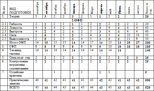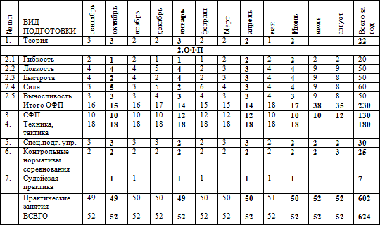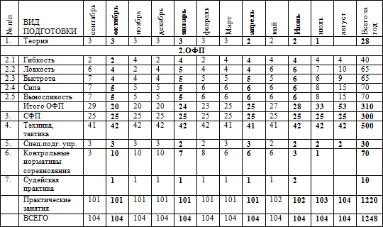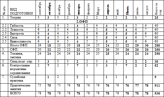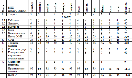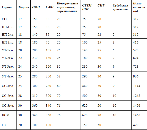 * часы в таблице указаны с учётом совмещения работы над школой базовых движений, специальной физической подготовки, совершенствованием технико-тактического мастерства и специальных подготовительных упражнений.
