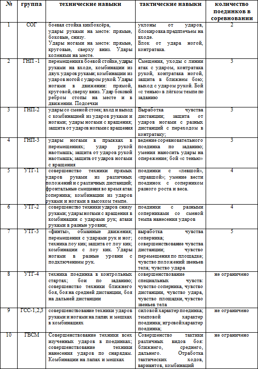 Программные требования к изучению двигательных умений и навыков в специализации кикбоксинг по годам обучения