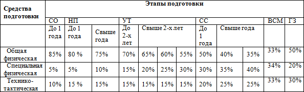 Таблица № 3 Соотношение средств физической и технико-тактической подготовки по годам обучения (%)