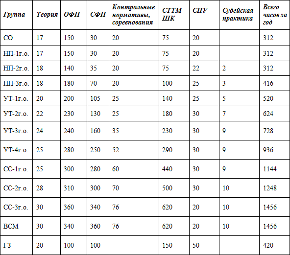 * часы в таблице указаны с учётом совмещения работы над школой базовых движений, специальной физической подготовки, совершенствованием технико-тактического мастерства и специальных подготовительных упражнений.