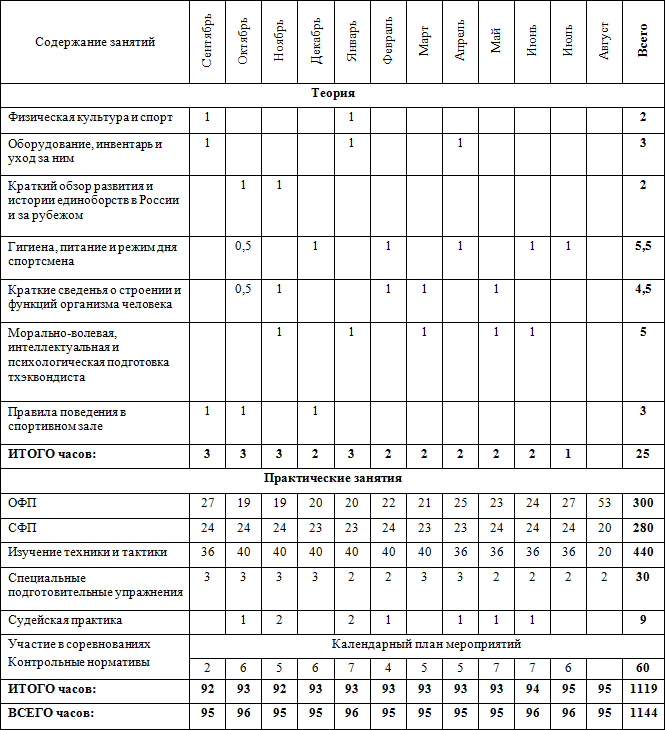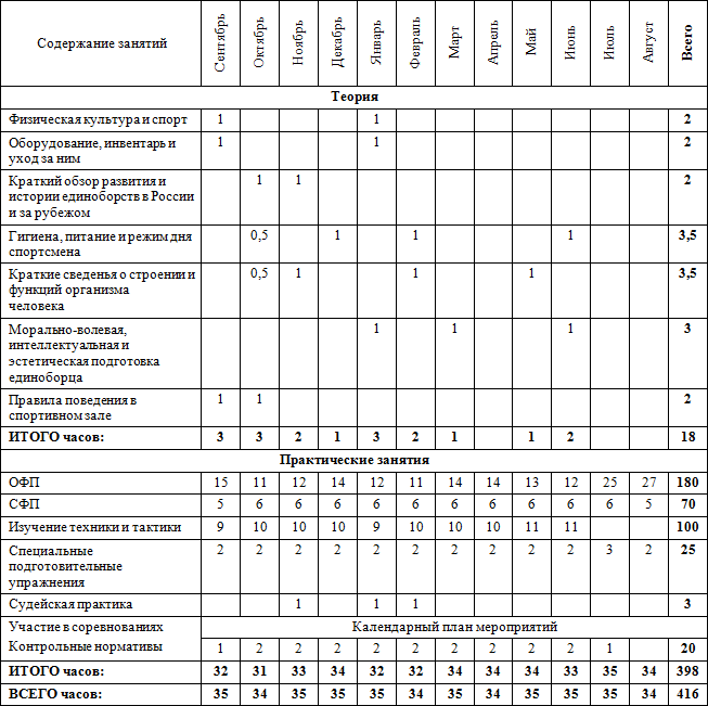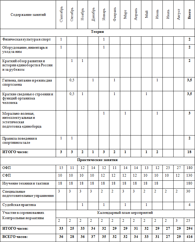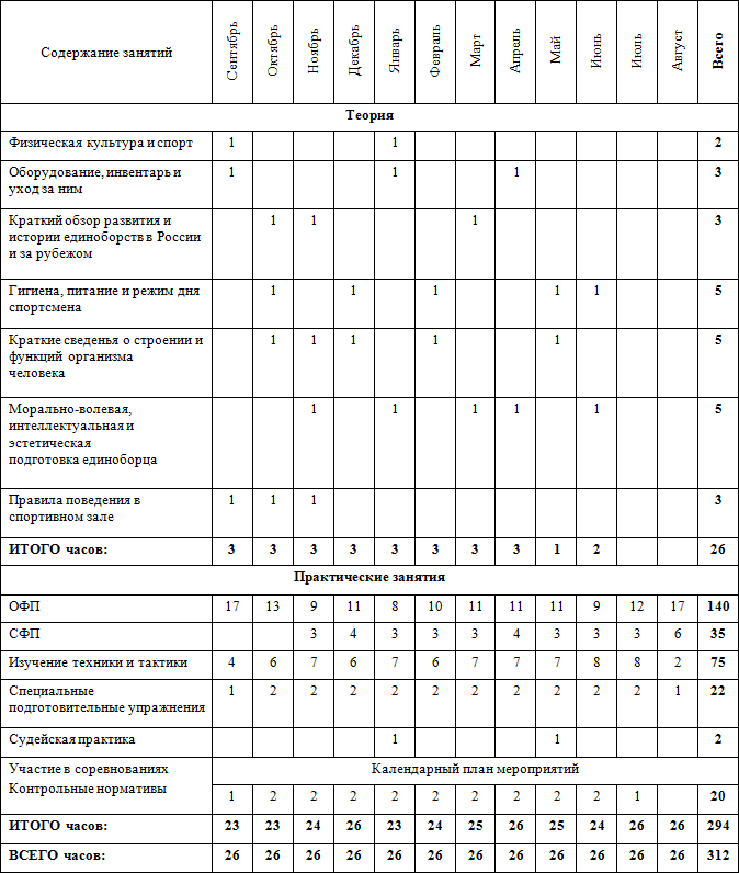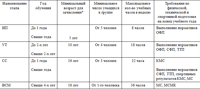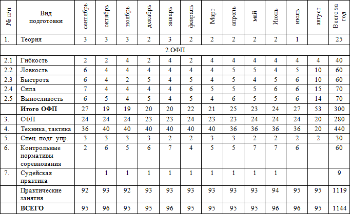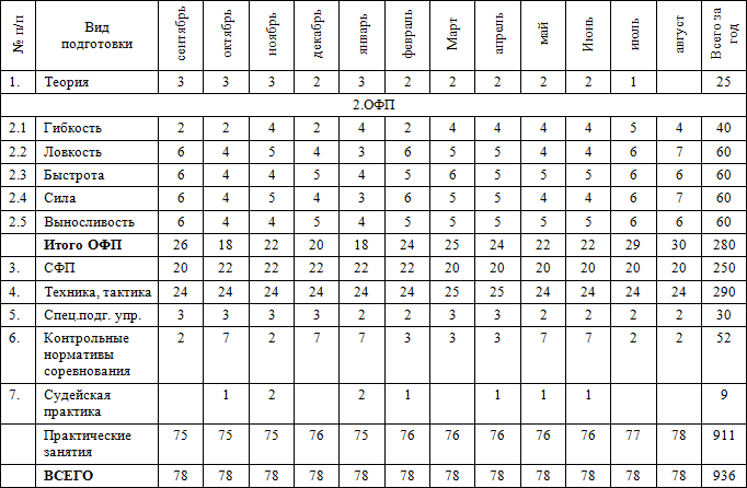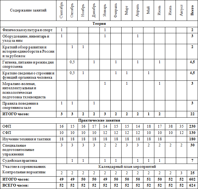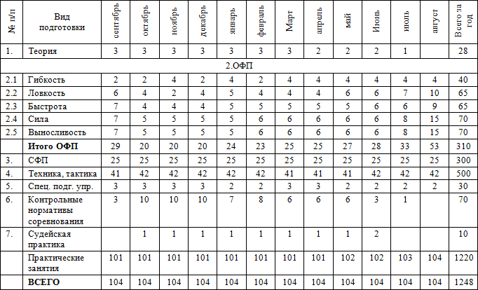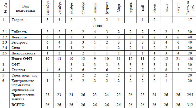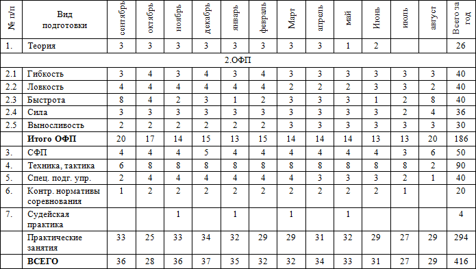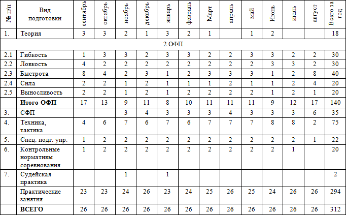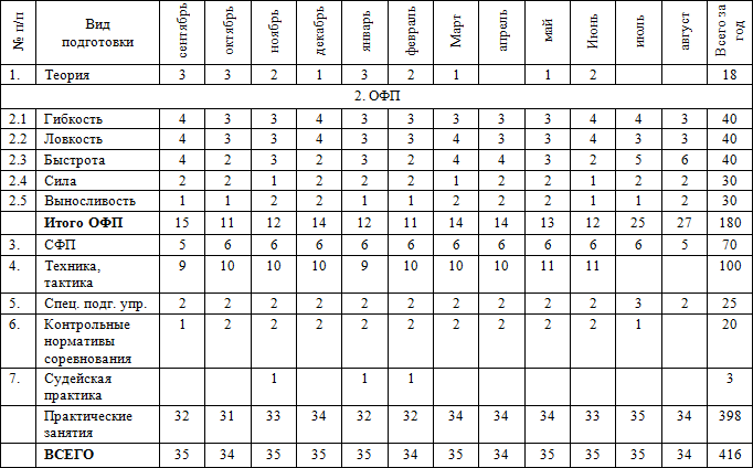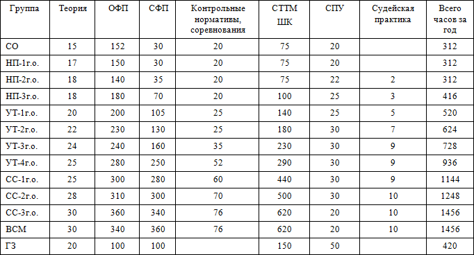 • часы в таблице указаны с учётом совмещения работы над школой базовых движений, специальной физической подготовки, совершенствованием технико-тактического мастерства и специальных подготовительных упражнений.