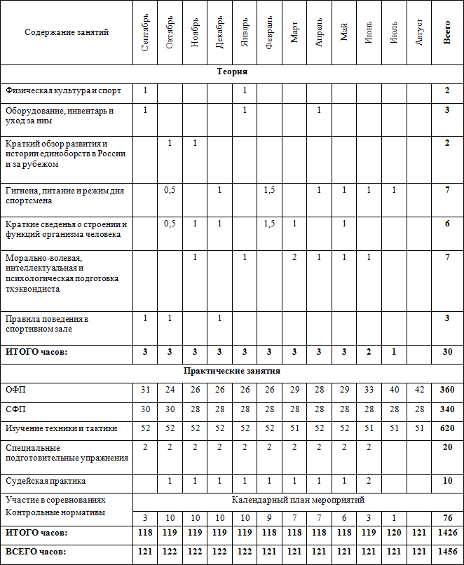 Тематический учебный план подготовки на год: ПАРАТХЭКВОНДО (ВТФ)