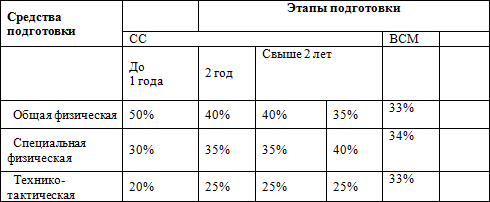 Таблица № 2 Соотношение средств физической и технико-тактической подготовки по годам обучения (%)