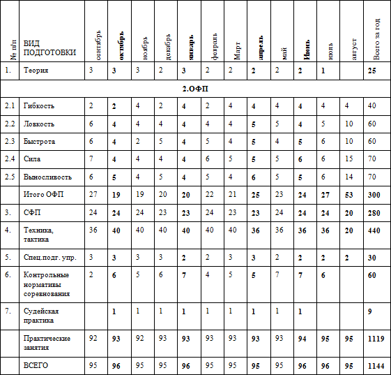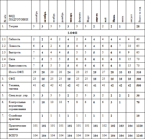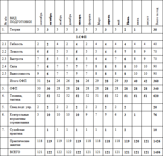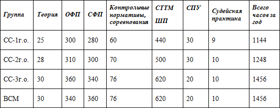 * часы в таблице указаны с учётом совмещения работы над школой базовых движений, специальной физической подготовки, совершенствованием технико-тактического мастерства и специальных подготовительных упражнений.