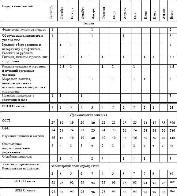 * общее количество часов содержания образования на каждом конкретном этапе подготовки определяется местным положением соответствующего образовательного учреждения, в данной программе указано примерное количество часов исходя из нормативных документов, накопленной практики работы ведущих специалистов в области пауэрлифтинга;