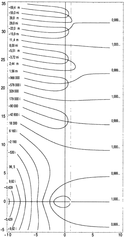 Еще раз: на рисунке 13.8 показана плоскость значении. Это не диаграмма типа «отсюда», подобная рисункам 13.6 и 13.7 ; наоборот, это диаграмма типа «сюда», которая показывает, что же дзета-функция делает с критической прямой, подобно тому как на рисунке 13.2 было показано, что функция возведения в квадрат делаете расчерченным квадратиком. Если мы желаем выражаться чисто математически, то следует сказать, что завивающаяся в петли кривая на рисунке 13.8 есть (критическая прямая) — множество всех точек, которые происходят из точек на критической прямой. Кривые на рисунках 13.6 и 13.7 суть – 1(вещественная и мнимая оси) — множество всех точек, которые дзета-функция отправляет в вещественную и мнимую оси. Мы используем запись « (критическая прямая)», чтобы указать на «все значения дзета-функции при аргументах, лежащих на критической прямой». Наоборот, « – 1(вещественная и мнимая оси)» означает «все аргументы, для которых значения дзета-функции лежат на вещественной или мнимой осях». Заметим, что выражение – 1используется здесь в специальном смысле теории функций и указывает на обратную функцию. Не следует путать его с a – 1из 8-го правила действий со степенями, где имеется в виду 1 /a,арифметическое обратное числа a. Это другое использование — еще один пример перегрузки математических символов, как и с буквой , которая обозначает и число 3,14159…, и функцию числа простых чисел.