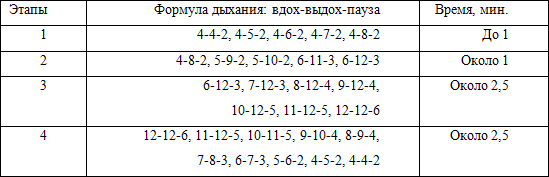 Таблица 4. Схема дыхательных упражнений.Первая цифра – вдох, вторая – выдох, третья – пауза после выдоха. Счет – по пульсу. При такой технике дыхательных упражнений тренирующийся вынужден следить за сложным переменным ритмом дыхания, этим достигается переключение внимания и его концентрация, в результате чего возникает нужный эффект. Этот эффект обусловлен не только переключением внимания, но и раздражением блуждающего нерва, окончания которого богато представлены по ходу дыхательных путей,