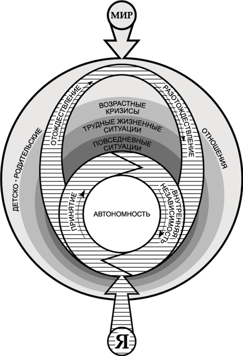 Рис. 3.1. Модель психологической сепарации (Н. Е. Харламенкова, Е. В. Кумыкова, А. К. Рубченко. Рисунок выполнен П. А. Харламенковым). По существу, Я включено в этот Мир по принципу взаимодействия с ним, посредством установления отношений, которые могут быть не только межперсональными, но и общественными, имеют широкий контекст и отличаются разнообразием, специфичны в разных возрастах. Специально подчеркнем, что на всех выделенных нами уровнях Мира – детско-родительских отношений, возрастных кризисов, трудных жизненных ситуаций, повседневных ситуаций – сепарация происходит в отношениях Я – значимый Другой.