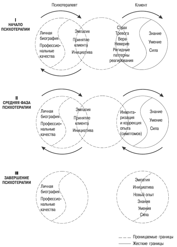 В начальной фазе психотерапии психотерапевт (имеющий собственный жизненный опыт, соответствующие профессиональные качества, опыт самораскрытия и инвентаризации личного психологического пространства, проницаемые внутренние и внешние границы «Я»), демонстрирует клиенту эмпатию, принятие его таким, какой он есть, инициативу. Клиент же предъявляет психотерапевту свои страхи, веру и надежду, что психотерапевт ему поможет, проявляет тревогу, ригидные паттерны эмоционально-поведенческого реагирования.