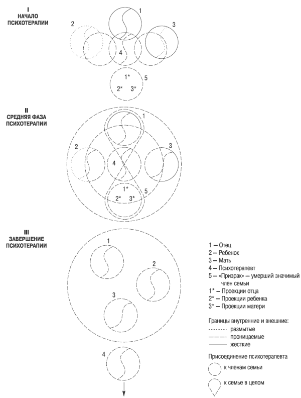 На рис. 2 графически изображена семья, состоящая из отца, матери, ребенка и «призрака» – умершего родственника, который в представлениях живых членов семьи занимает главенствующее место в силу тех проекций, которыми семья его наделяет. В первых двух фазах семейный психотерапевт устанавливает контакт со всеми вместе и с каждым в отдельности, выстраивая уровни интеграции и общности семьи.