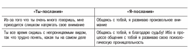Упражнение, предлагаемое Н. Ю. Хрящевой и ее коллегами, направлено на осознание участниками группы трудностей, возникающих в общении между ними, и выявление их потенциального позитивного смысла. Эта цель достигается с помощью превращения «Ты-посланий» в «Я-послания». Известно, что «Ты-послания» обычно содержат явный или скрытый упрек в адрес другого, создающего проблемы. Форма «Я-посланий» позволяет сформулировать конструктивное значение этой проблемы для самого субъекта. Авторы приводят следующие примеры трансформации «Ты-посланий» в «Я-послания» (Психогимнастика в тренинге, 1999, с. 142–143).