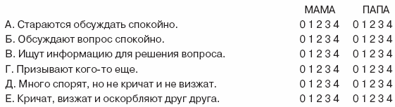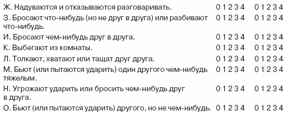 Шкала тактики поведения в конфликтах (цит. по: Бэрон, Ричардсон, 1997) Это список того, что твои папа и мама могут делать, когда у них конфликт. Вспомни все, а не только самые серьезные размолвки, и укажи, как часто при этом каждый из них совершает поступки, перечисленные ниже. Используя расшифровку, обведи кружком число, которое лучше всего показывает, как твои папа и мама решают свои проблемы. 0 – никогда; 1 – почти никогда; 2 – иногда; 3 – почти всегда; 4 – всегда.Примечание. М. Штраус и С. Штайнметц разработали «Шкалу тактики поведения в конфликтах» для изучения конфликтов между членами семьи. Хотя приведенный выше пример предназначен для оценивания конфликтов между родителями, инструкции легко переделать для оценивания конфликтов между любыми другими членами семьи.