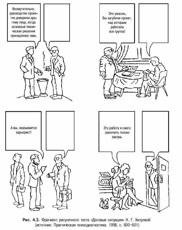 Внутриличностные конфликты, по мнению ряда исследователей, могут быть диагностированы путем выявления внутренних противоречий между различными сторонами «Я», личностными мотивами, тенденциями и т. д. Например, в работе отечественных исследователей конфликты у больных неврозами связывались с расхождением их представлений о своем «реальном» и «идеальном» «Я» (Иовлев и др., 1976). Е. Б. Фанталовой предложена методика «Уровень соотношения „ценности“ и „доступности“ в различных жизненных сферах», предлагающая приемы распознавания внутренних конфликтов как «расхождений» между «ценностью» и «доступностью». Испытуемым предлагается список из 12 понятий, каждое из которых, по мнению автора, обозначает одну из общечеловеческих ценностей (например, «здоровье», «интересная работа», «любовь», «наличие хороших и верных друзей»). Попарное сравнение и оценка осуществляются сначала по принципу большей значимости, затем – доступности. «Разрыв» между «ценностью» и ее «доступностью» при более высоком показателе «ценности» рассматривается как индикатор внутреннего конфликта. Кроме того, могут быть использованы известные проективные методики, выявляющие соответствующие личностные особенности (например, ТАТ).