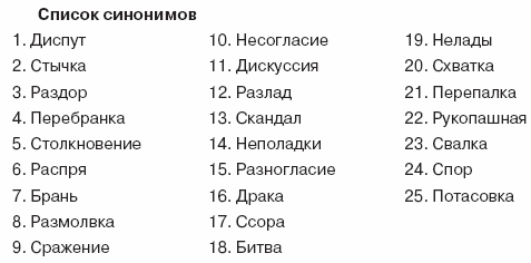 Перед Вами список слов, в различной степени связанных с понятием «конфликт». Слова в списке расположены в случайном порядке. Вам необходимо распределить все слова списка на отрезке прямой справа и слева от термина «конфликт» таким образом, чтобы расстояние между каждым словом и термином «конфликт» отражало их смысловую близость. Важны именно эти расстояния, справа и слева слова распределяются лишь для удобства, так как примерно в одной точке может быть помещено несколько слов.