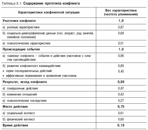 Из этих основных характеристик конфликта и состоит, по результатам проведенного исследования, его прототип. Перечень характеристик конфликта приведен в табл. 5.1 с указанием удельного веса каждой характеристики, определявшегося на основе частоты ее появления в общем перечне.