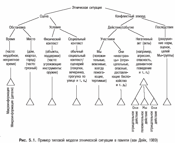 Подтверждением полученного нами результата явилось его сходство с анализом структуры этнической конфликтной ситуации, предпринятым Т. ван Дейком. Его анализ конкретных текстов, рассказов о событиях показал, что в них в качестве инвариантных присутствуют такие элементы социальных ситуаций, как Время, Место, Окружение, Условия, Участники (в различных ролях), События или Действия с их возможной оценкой (ван Дейк, 1989). Ван Дейк иллюстрирует представление о типовой модели конфликта на примере анализа этнической ситуации в виде следующей структуры (рис. 5.1). Специфической особенностью моделей этнических ситуаций, по мнению автора, является присутствие такого структурного параметра, как оппозиция «Мы – Они» (или «свой – чужой»), которая, в свою очередь определяет оценку ситуации, «точку зрения» ее участников. (Ван Дейк в качестве примера приводит начало одного из рассказов своих респондентов: «Нам надо было встать рано утром, а ТЕ готовы были веселиться хоть всю ночь».) Модель, представленная на рисунке, отражает такую «пристрастную» информацию: Мы – «положительные, вежливые, всегда помогающие, терпимые»; Они – «иностранцы» – «отрицательные, опасные, доставляющие беспокойство и т. д.»; Мы – «положительное действие», Они – «отрицательное действие».