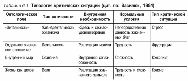 В своей книге «Психология переживания», посвященной рассмотрению критических ситуаций, переживаемых человеком, Ф. Василюк анализирует четыре основных понятия, которыми оперирует психология при описании этих ситуаций: стресс, фрустрация, конфликт и кризис. Разным типам критических ситуаций соответствуют различные онтологические поля: так, конфликт соотносится автором с онтологическим полем внутреннего мира, а онтологическим полем кризиса является жизнь как целое (Василюк, 1984), (табл. 6.1).