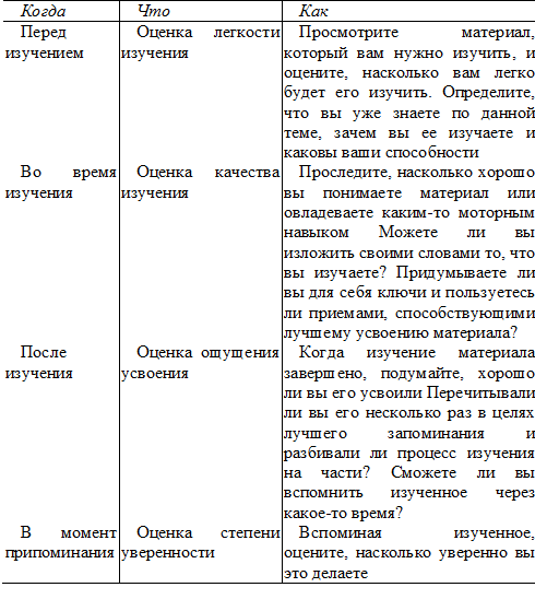 Нельсон и Наренс (Nelson Narens, 1990) разработали ряд приемов, с помощью которых можно оценить метапамять человека. Взяв их за основу, можно развить собственную метапамять. Например, перед тем как приступить к изучению чего-либо, оцените, насколько легко, по вашему мнению, вы сумеете усвоить материал. Это оценка легкости изучения. Если вы – старшекурсник колледжа, профилирующий предмет в учебной программе которого – социология, вы можете посчитать, что материал, представленный в тексте по общей психологии, вы выучите без труда. В то же время вы можете решить, что курс восточной философии будет совсем не просто освоить. Смысл оценки легкости изучения в том, что она заставляет вас задуматься о материале, который вам предстоит изучить, о том, что вам уже известно по данной теме, о своих способностях в этой области и о том, в какой обстановке будет проходить процесс изучения. Подобные размышления помогут вам определить, сколько времени и умственных усилий