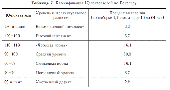 Оценки по шкале Векслера сопоставлялись с оценками, которые получают те же испытуемые по шкале Стэнфорд-Бине. Как правило, интеллектуалы получают более высокий балл по шкале Стэнфорд-Бине, нежели по шкале Векслера. Наоборот, интеллектуально отсталые получают более высокие оценки по тесту Векслера, нежели по тесту Стэнфорд-Бине.