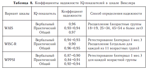 Надежность WAIS весьма велика: 0,97, по шкале вербальной – 0,96, а по шкале действий – 0,93.