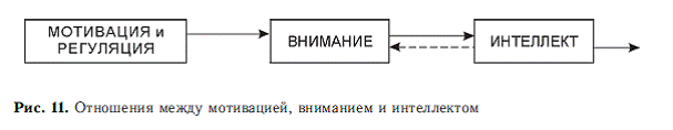 Разумеется, внимание выступает как бы опосредующим звеном между блоком регуляции и планирования поведения (по А. Р. Лурия) и блоком когнитивным. Поясним это отношение простой схемой: