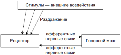 Каждый орган чувств (глаз, ухо, чувствительные клетки кожи, вкусовые сосочки языка) специализирован на приеме и переработке различных специфических внешних воздействий. Основная часть каждого органа чувств – окончания чувствующего нерва – рецепторы. Они превращают энергию внешнего раздражителя в нервный импульс. Воздействие, способное возбудить рецептор, называется стимулом.